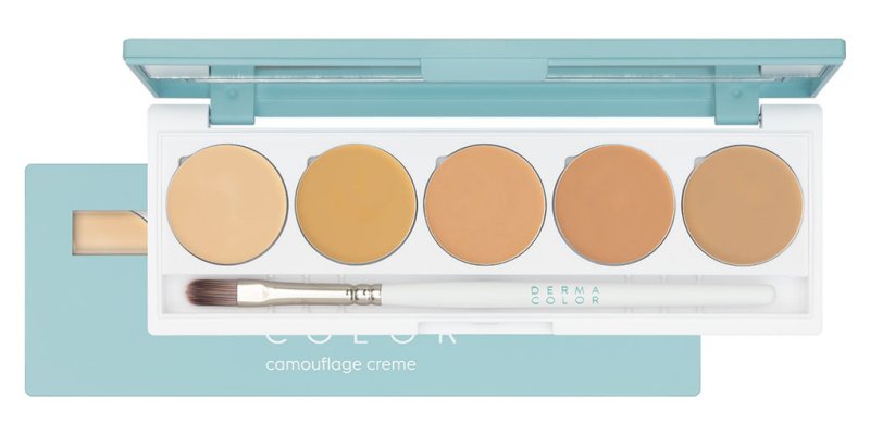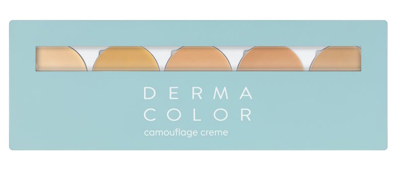 Paleta kamuflaży. Wchodzi w skład serii Dermacolor - specjalistycznej serii oferującej make-up odporny na wodę i ścieranie, służący niezawodnemu pokrywaniu kłopotliwych wad i usterek skóry. Kamuflaż idealnie sprawdza się przy tuszowaniu wszelkich niedoskonałości jak np. blizny potrądzikowe, popękane naczynka, zaczerwienienia, przebarwienia i plamy na skórze. Produkt znajduje swoje zastosowanie również przy kamuflowaniu tatuaży, cieni pod oczami, czy blizn po poparzeniach. Zamknięcie kilku odcieni kamuflaży w jednej paletce czyni ją uniwersalną i niezbędną przy tuszowaniu różnego rodzaju niedoskonałości u osób z każdym typem skóry. Kamuflaż jest wodoodporny, utrzymuje się na skórze do 36 godzin, nawet w ekstremalnych warunkach. Produkt zdobył sympatię wielu użytkowników na całym świecie, idealnie nadaje się do użytku codziennego ale również sprawdzi się na planie zdjęciowym czy na scenie teatr. Paletka dostępna jest w kilku odcieniach, dzięki czemu łatwo znaleźć produkt odpowiedni do własnych, specyficznych potrzeb i odcienia skóry. Dzięki kamuflażom cera będzie idealnie przygotowana do dalszego etapu wykonywania makijażu, a każda niedoskonałość skórna pozostanie niewidoczna przez cały dzień. Kosmetyk jest bardzo wydajny i już za pierwszym razem można otrzymać pożądany efekt. Odpowiednia konsystencja produktu umożliwia jego sprawne rozprowadzenie na twarzy. Dodatkowo w gamie kolorów znaleźć można kamuflaże specjalistyczne, jak na przykład zielony, który idealnie nadaje się do cery naczynkowej bądź z zaczerwienieniami. Żółty odcień natomiast idealnie pokryje cienie pod oczami i sprawi, że spojrzenie stanie się odświeżone. W skład paletki wchodzi pędzelek do aplikacji kamuflażu na problematyczne miejsca, jak również lusterko.
